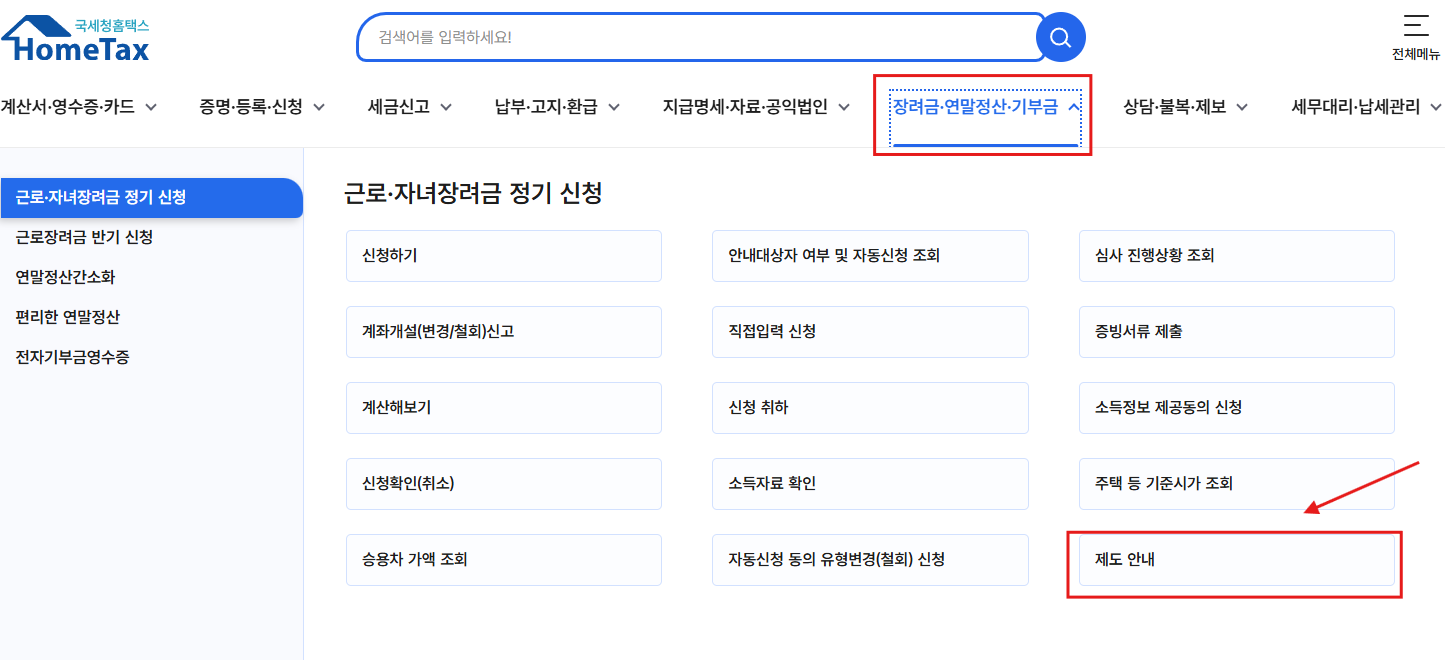 - * 홈택스(PC) 로그인 → 장려금ㆍ연말정산ㆍ전자기부금 → 근로ㆍ자녀장려금 정기신청 → 신청하기