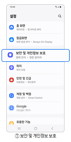 1단계) 설정에서 보안 및 개인정보 보호를 선택합니다.