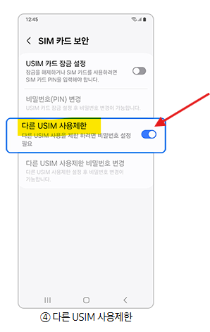 3단계) 다른 USIM 사용제한을 눌러 활성화되어 있다면 해제해 주세요.