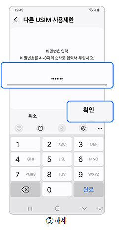 USIM 설정에서 다른 USIM 사용제한이 설정된 경우 설정한 비밀번호를 입력하시면 해제할 수 있습니다.
