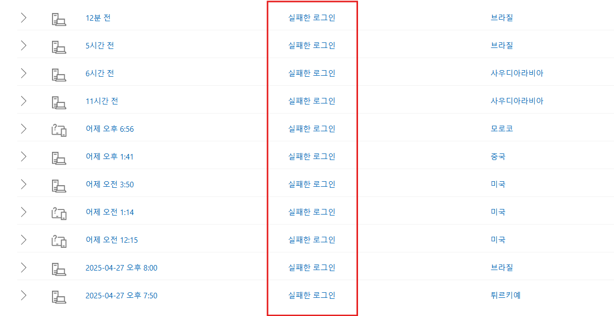 마이크로소프트 계정에 남아 있는 로그인 기록은 단순한 데이터가 아닙니다. 내가 아닌 다른 누군가가 내 계정에 로그인한 시도까지도 확인 할 수 있습니다: 활동 경로, 로그인한 디바이스, 심지어 접속 위치까지 모두 저장이 됩니다. 무차별적으로 하루에도 수십번씩 다양한 경로 로그인을 시도하는 흔적들을 보실 수 있을 겁니다.