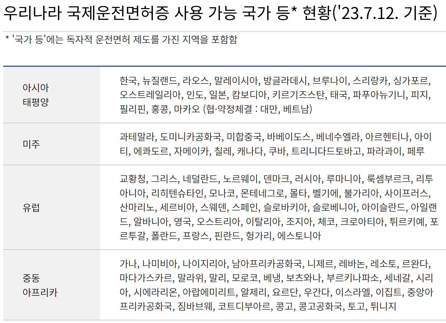 ※ 국가별로 영문 운전면허증 사용기간이나 사용요건(여권소지 등)이 다를 수 있으므로, 출국 전 해당국 한국대사관을 통해 사용요건 등을 정확히 확인하시기 바랍니다.