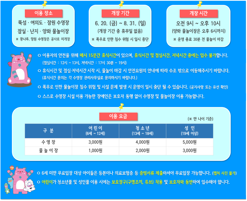 여름이 시작되면 누구나 찾게 되는 도심 속 피서지, 바로 한강 수영장입니다! 2025년 한강 수영장 및 물놀이장이 드디어 6월 20일(금)부터 개장하여 8월 31일(일)까지 운영됩니다. 이번 여름, 가까운 곳에서 시원하고 저렴하게 물놀이를 즐겨보세요.